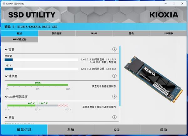 通过铠侠官方推出的固态硬盘管理软件SSD Utility可以看到这块铠侠SF10的主要信息和状态,比如总容量、可用空间、健康度和温度。各位使用铠侠固态的小伙伴可以下载这个软件来管理你的硬盘,监控数据比第三方精准很多,还支持一键更新固件,非常方便。