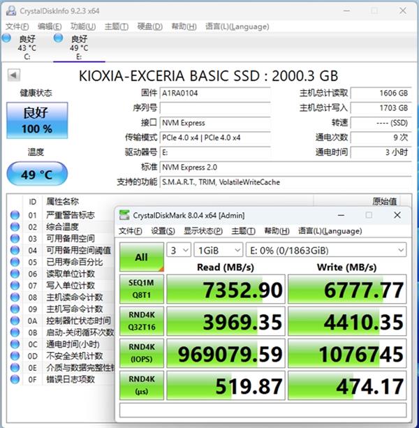 在这个项目中,铠侠SF10的随机读写速度为969K IOPS、1076K IOPS;持续读写速度为7352MB/s、6777MB/s,这个速度已经强于很多PCIe 4.0硬盘了,其中包括一些老的旗舰型号。测试结束后,铠侠SF10的温度从46℃上涨到49℃,发热并不严重。