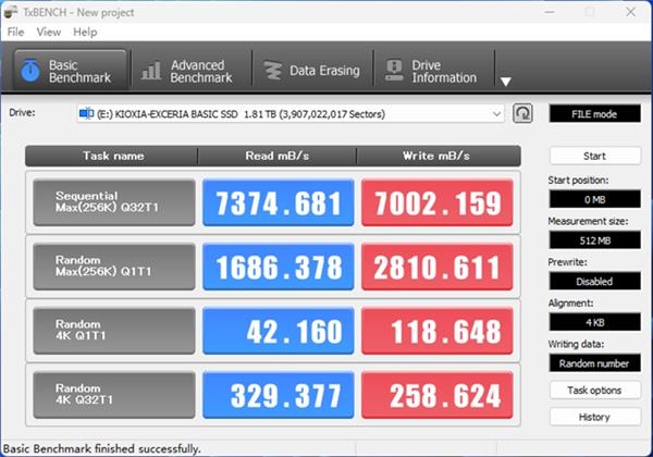 在此项目中,铠侠SF10的各项成绩也都很理想,尤其是顺序写入突破7000MB/s,比标称值高了接近3%。