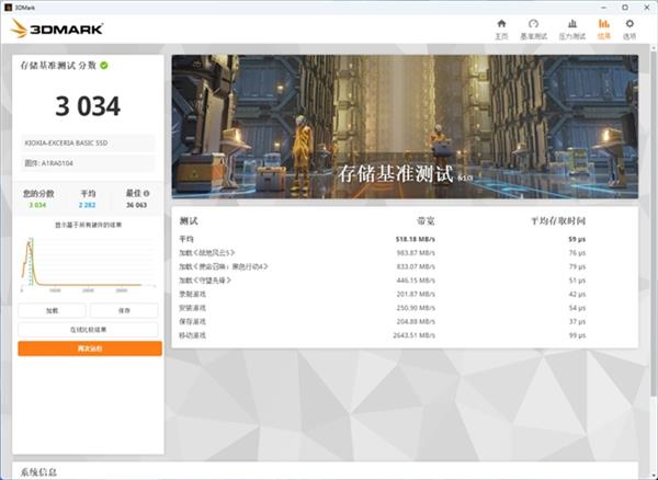 3DMark更侧重于测试固态硬盘在游戏方面的性能,涵盖的子项基本都是游戏玩家经常遇到的典型场景,比如加载、录制、移动等。铠侠SF10在这个项目中得到了3034分,已经远远超过了平均水准,制约它跑分更高的原因可能是平均存取时间(延迟)相比旗舰要更高。好在实际玩游戏时,固态硬盘的延迟并不会对游戏帧数造成明显影响,绝大多数卡顿都是由其他配件引起的。