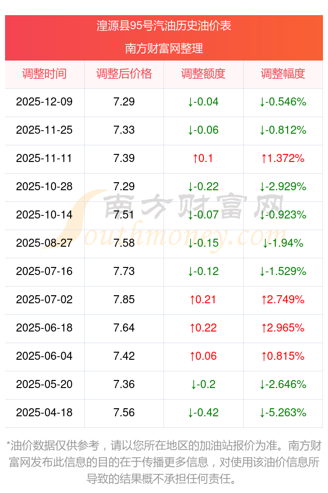 12月18日湟源县汽油柴油每升的价格为12月9日调整后的价格,具体如下:92号汽油6.8元;95号汽油7.29元;89号汽油6.38元;0号柴油6.41元。
